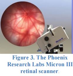 Retinal Imaging: Retinal imaging was performed on Days 14 and 28. Fluorescein dye was administered intravenously and optical density staining was visualized using the Phoenix Research Labs Micron III retinal scanner (Figure 3), including the recording of ~45 sec/animal of high-definition digital video. Videos of the retina immediately after fluorescein dye injection were made.