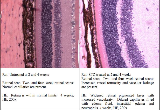 Introduction: Diabetes is associated with retinal microvascular changes that include leakage, increased neovascularity, and increased tortuosity, as well as neutrophil attachment and leukostasis. The streptozotocin (STZ)- induced model of diabetes in rats serves as a validated and reproducible model of retinal hypervascularity in Brown Norway rats. Body weights and blood glucose levels were monitored weekly. At two and four weeks, retinas were examined using the Micron III retinal scanner (Phoenix Research Labs, Pleasanton, CA). Optimized Computer Tomography (Bioptigen Envisu R-Class System, Bioptigen, Durham, NC) for preclinical research) determinations were performed pre-study, at several time points and prior to necropsy. Histologic examination of the eyes was also performed. In-vivo fluorescein angiography as displayed by the Micron III and OCT coupled with histopathologic assessment of the vasculature of the retinal pigmented layer allows for a complete assessment of microvascular retinal effects in this model. All in vivo experiments were conducted in accordance with the ARVO Statement for the Use of Animals in Ophthalmic and Vision Research and the guidelines established by the Animal Care Committee at Comparative Biosciences, Inc, an AAALAC accredited facility.