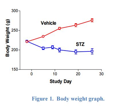 Body Weights: STZ-treated rats lost body weight over the four-week period while untreated animals gained weight (Figure 1).