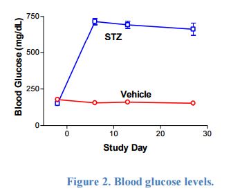 Blood Glucose Monitoring: Blood glucose levels were determined pretest and weekly thereafter (Figure 2). Hyperglycemia was observable almost immediately and became evident by one week. Control glucose was in the range of 153±16 mg/dL range and STZ-treated glucose levels were consistently in the 765±98 mg/dL range from Week 1-4.