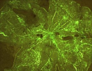 Rodent Oxygen-Induced Retinopathy is a preclinical model for Retinopathy of Prematurity in premature infants. OIR, consisting of proliferation of new vessels on the retina with concomitant inflammation may be induced in rodent neonates, by placing them into a hyperoxygenated environment for 2 weeks and then removing them to a normal air environment. During this time period and for several weeks following return to normal air, proliferation of new vessels forming characteristic capillary tufts on the retina and inflammation develop. These lesions as well as the response to therapeutic treatment may be assessed by the following: