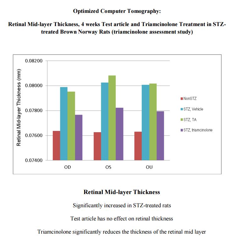 Optimized Computer Tomography: OCT was conducted pre-study and at one month. STZ treatment produced a consistent and low variability thickening of the middle retinal layers. Treatment with triamcinolone significantly reduced STZ-induced retinal thickness.