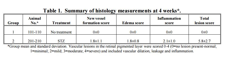 Untreated eyes were within normal limits. In the STZ-treated rats, there was increased new vessel formation, reactive endothelium, dilated capillaries distended with either blood or edema fluid, acute inflammation composed of intravascular neutrophils, neutrophils adhered to vessel walls and extravascularly. Additionally, there were neutrophils free in the retina and vitreous, and there was some fibrinous debris in the vitreous. Occasional necrolytic debris was also present in the retina. While lesions were present in all animals, there was considerable variation in severity of the lesions. Vascular lesions corresponded with the retinal scans. In Group 1 capillaries were clearly visible and there was no tortuosity or evidence of leakage, while in the STZ-treated groups, vascular tortuosity and vascular leakage was clearly present. The histologic scores are summarized in Table 1.