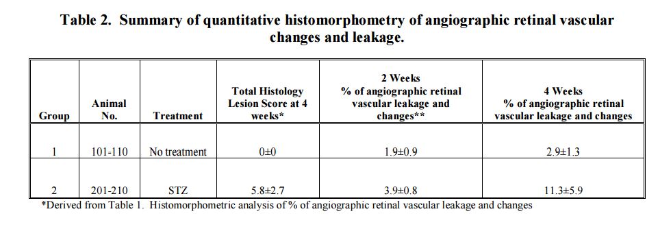 - Four weeks: Retinal vascularity was markedly increased in STZ-treated rats with areas of leakage, particularly surrounding the optic nerve.